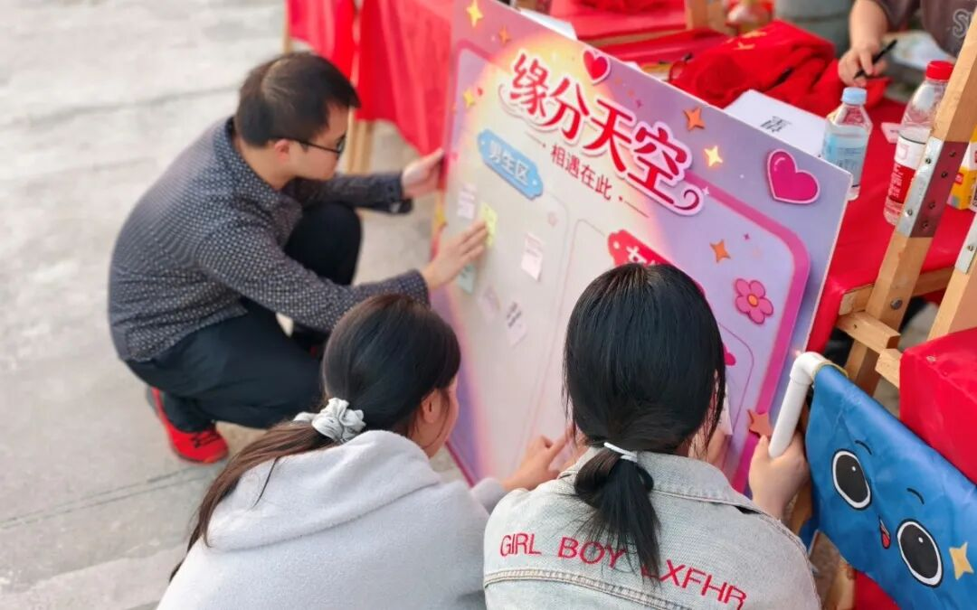 活动开始,参与者有序填写个人信息,通过匿名编号保护隐私,大家还将心愿写在彩色便利贴上粘贴于缘分展板,在轻松的交流中寻觅心动信号。现场同步宣传拒绝天价彩礼、勤俭节约的文明婚恋理念。