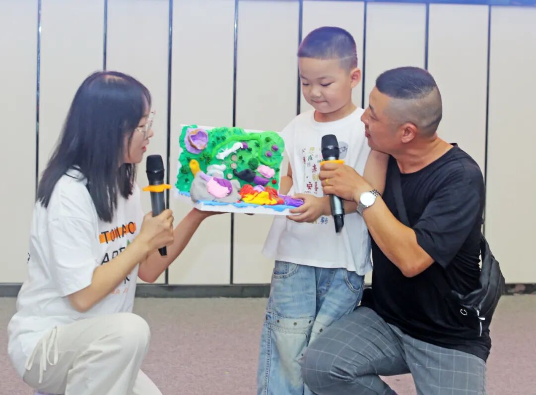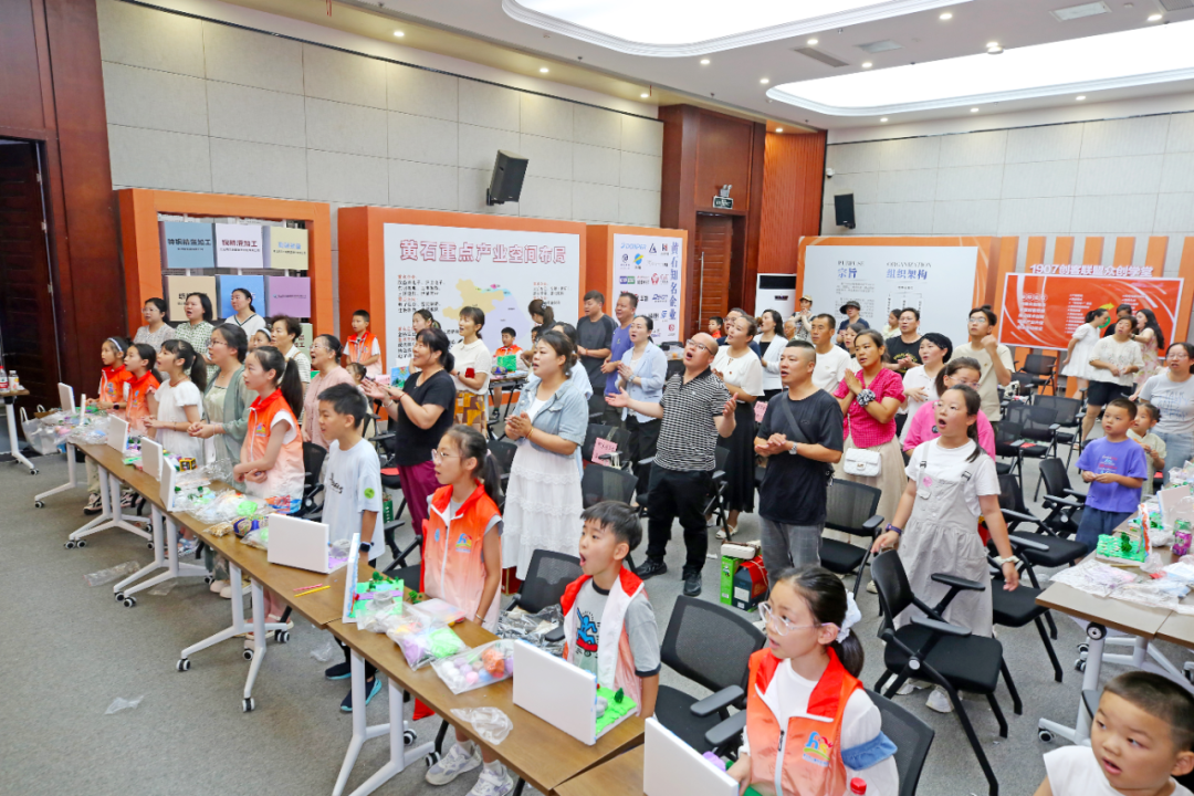 活动还设置了沉浸式体验环节。蕃茄田艺术&晓时候研学华新校区的老师分别引导成人组开展非遗宋锦手工制作,在经纬交织中感受传统织锦的细腻;引导儿童组用超轻土创作两地特色景物,新疆的火焰山、天山与黄石的天坑在作品中同框,以艺术形式诉说 “黄阿一家亲”的深情。在才艺展示环节,两地家庭带来舞蹈、朗诵等精彩节目,全体嘉宾齐声合唱《花开中国》,现场洋溢着民族团结的欢乐氛围。值得一提的是,本次活动还邀请了黄石市“小燕子儿童观察团”参与,和最美家庭代表共同见证两地人民之间的深厚友谊。小观察员张依依介绍自己创作的黏土画:“黄石的港饼和新疆的馕手牵着手,这象征着两地人民友谊长存。”